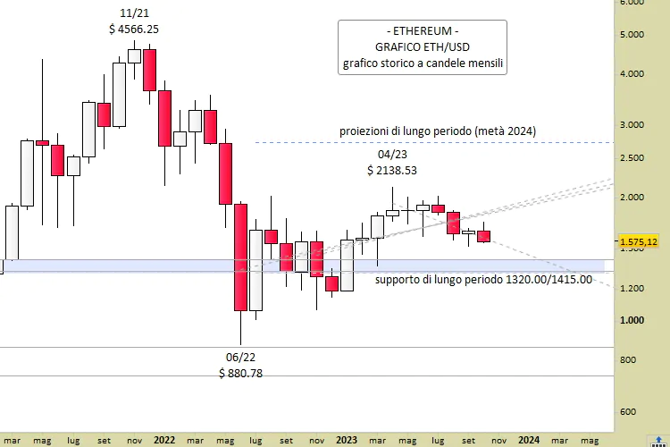 Su grafico storico con candele mensili possiamo vedere come, in un contesto di lungo termine, non ci siano state lesioni alla tendenza rialzista che sta proseguendo dalla metà del 2022. Sono però aumentate notevolmente le probabilità di assistere, entro la fine dell’anno, ad un test ravvicinato dell’area di supporto di lungo periodo, attualmente passante fra i 1320.00/1415.00 dollari. Tale area corrisponde sostanzialmente alla zona dei “vecchi” massimi storici raggiunti da questo mercato a gennaio 2018.