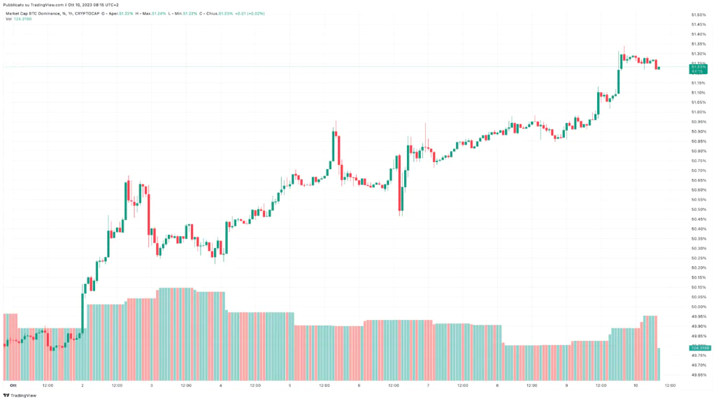 La teoria che sosteniamo in questo approfondimento è che Bitcoin svolga, nel mondo crypto, lo stesso ruolo che storicamente appartiene nel mondo fiat al dollaro USA, in parte allo yen e – nei metalli, all’oro. Il primo grafico al quale guardare è certamente quello della dominance BTC, che da inizio ottobre ha continuato a crescere e che ha vissuto un ulteriore boost in coincidenza con l’inizio della guerra in Israele.