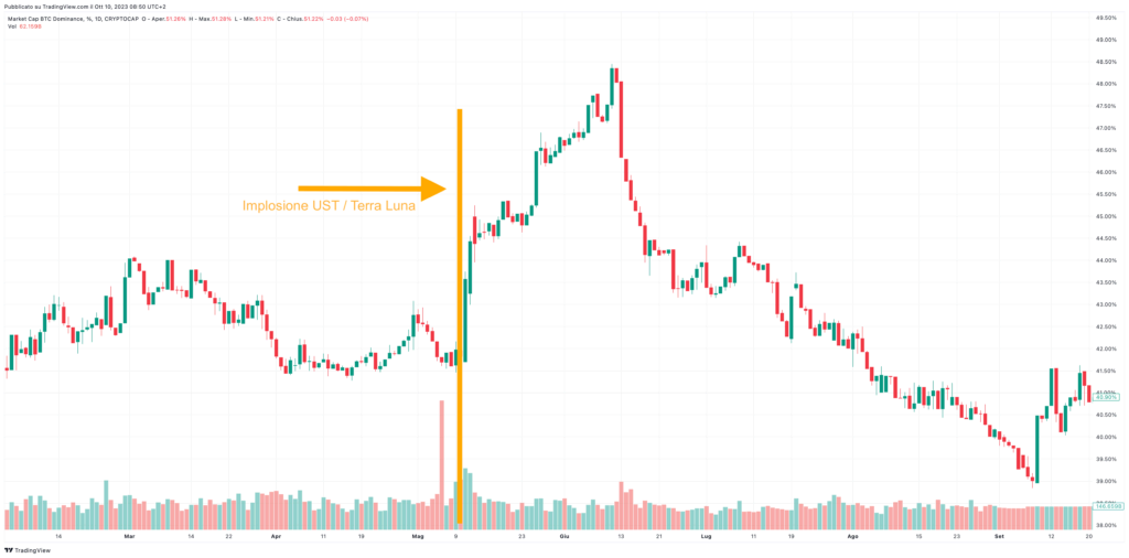Il grafico che riportiamo qui sopra riguarda il 10 maggio 2022, data che è evidenziata in giallo. È il giorno dell’implosione di Terra Luna, l’evento che ha poi innescato il crollo di 3AC, di Celsius e del grosso delle aziende fallite del settore. Un fulmine a ciel sereno e anche in questo caso la reazione dei mercati è stata di dirigersi verso Bitcoin.
