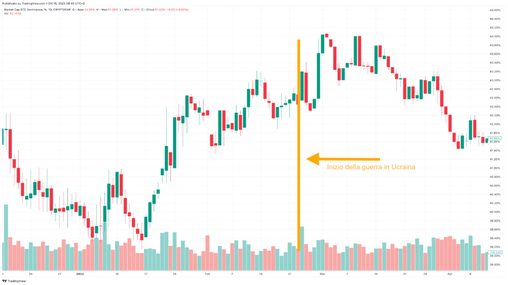 Ultimo grafico che riportiamo a sostegno della nostra tesi è quello che riporta i movimenti di Bitcoin in seguito all’invasione russa dell’Ucraina. Anche qui la nostra tesi sembra reggere senza dubbi o possibili contestazioni.