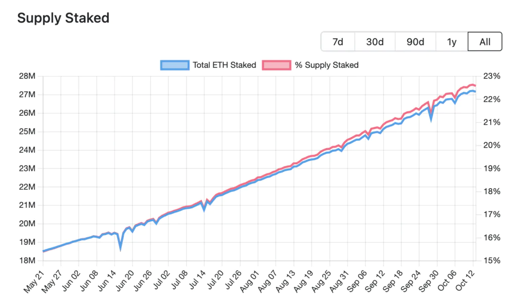 Siamo a oltre il 22% del totale degli Ethereum esistenti che sono stati messi in staking, con le APR che sono in calo. Chi voleva entrare nello staking ha avuto tutto il tempo del mondo per farlo e ora chi cambia idea e decide di mettere anche i suoi in staking è quantitativamente minore.