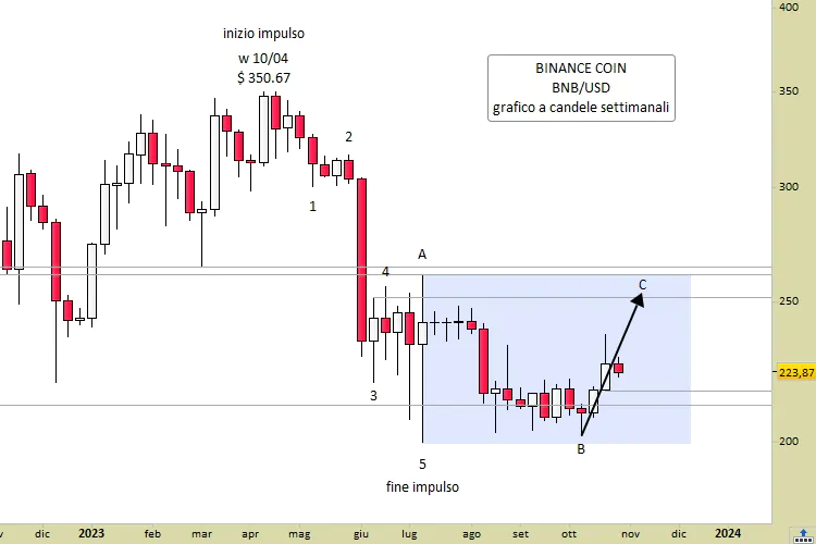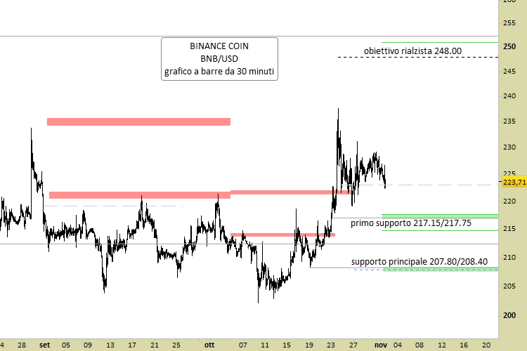 Le quotazioni di BNB, la crypto coniata da Binance, hanno raggiunto l’ultimo minimo significativo nel cambio contro dollaro americano il 9 ottobre scorso, a quota 202.39, in deciso avvicinamento al primo target ribassista che avevamo indicato fra 200.00/201.00 con la nostra analisi più recente. Di seguito è scattato un robusto recupero che, per il momento, pare essersi esaurito sul picco relativo del 24 ottobre a 237.81.