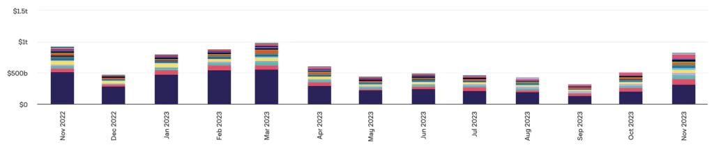 Sempre meno scambi, con novembre che è stata un’eccezione che però è lontana dai volumi raggiunti nel marzo 2023, volumi che rispetto a 2021 e 2022 sono comunque molto bassi.