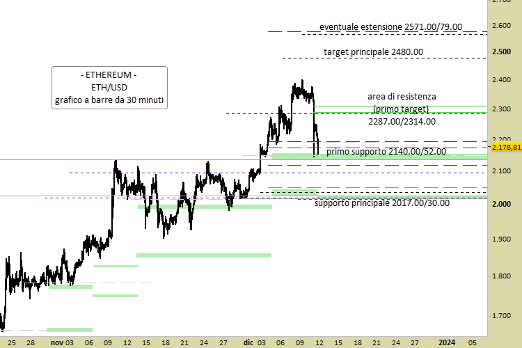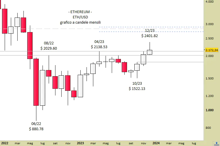 Su grafico ad ampia scansione temporale, con candele mensili, vediamo come durante la prima parte di dicembre i valori siano riusciti a perfezionare la rottura dell’ampia area di resistenza di lungo periodo che era situata fra i 2029.00/2139.00. Tali livelli corrispondono rispettivamente al picco di agosto 2022 ed a quello di aprile 2023.