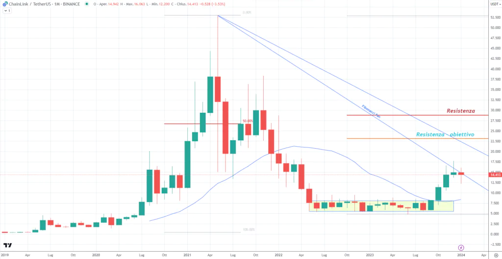 L’obiettivo vettoriale successivo di LINK è quello della resistenza che passa a 21,100$. Se andiamo a sommare la situazione vista in precedenza sul grafico monthly con quella attuale sul weekly, emerge una significativa area di resistenza tra 21,50 e 23$. Questa fascia potrebbe rivelarsi particolarmente ostica da superare nel corso del 2024.