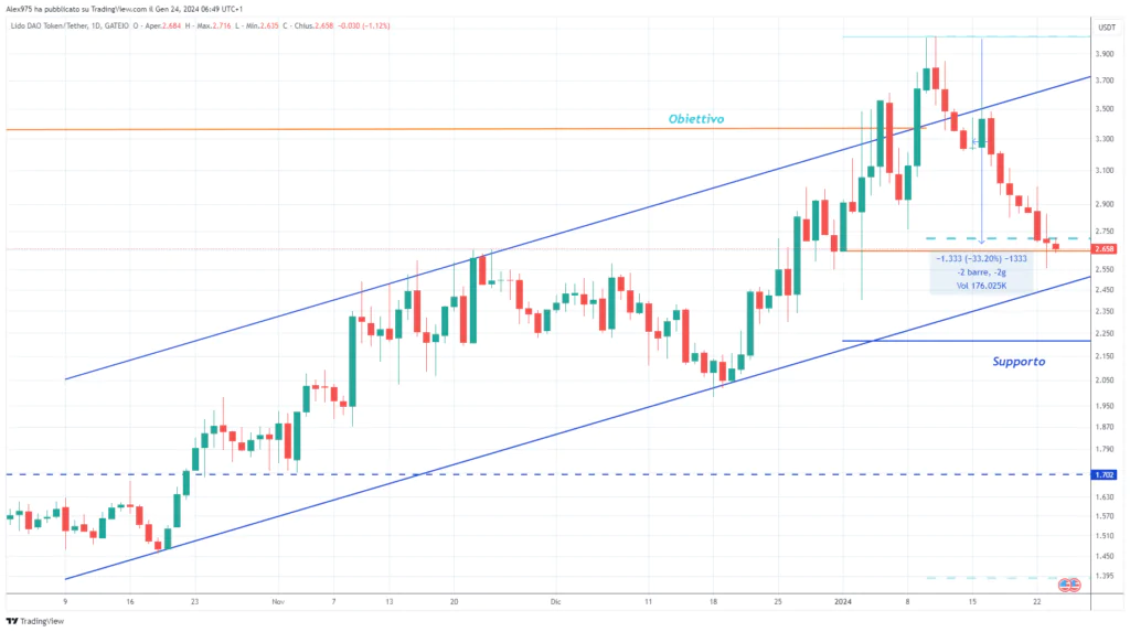 Dalla presa della resistenza, Lido è in calo, ma si sta muovendo ancora all’interno del canale rialzista evidenziato in blu. Dal recente massimo a 4,036$ il prezzo di LDO sta subendo una contrazione del 31%, avvicinandosi al suo primo livello di supporto a breve termine fissato a 2,70 dollari.