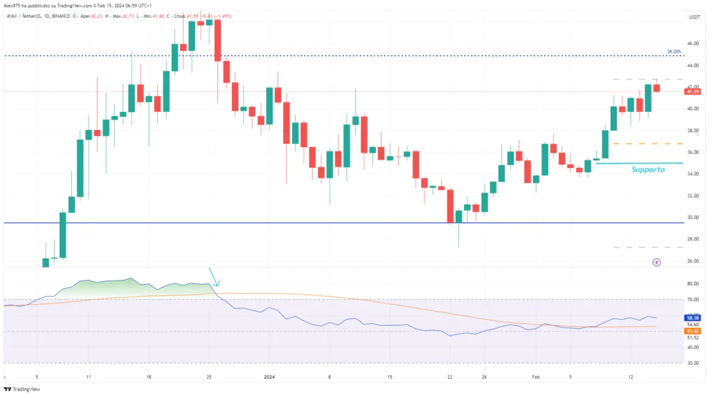 Passando ad una view sul grafico weekly, ci focalizziamo sui movimenti di Avalanche che ha fatto dal minimo di periodo a 8,78$ di Settembre scorso. Qui possiamo cogliere la fase rialzista, con l’arrivo a Dicembre sulla resistenza – obiettivo a 45$. Il prezzo ha fatto un massimo a 49,96$ per iniziare una fase di ritracciamento, con una candela da -20% già a fine 2023.
