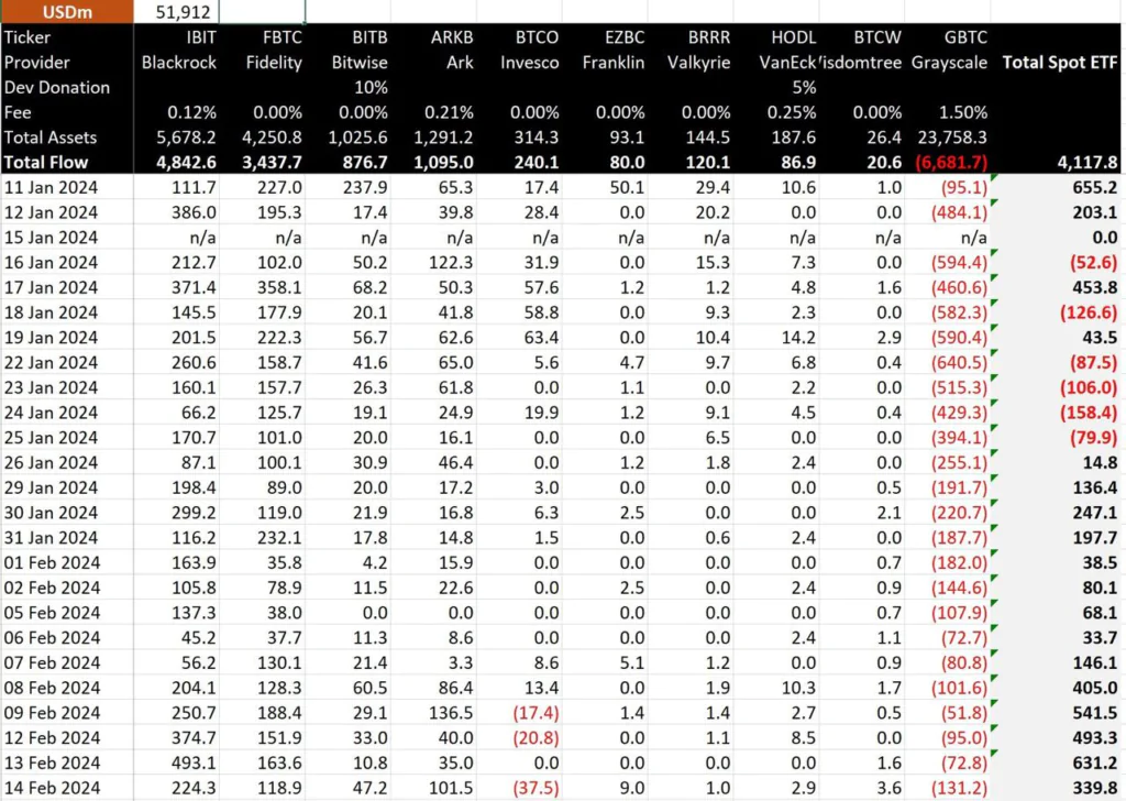 C’è un rallentamento, almeno per la giornata di ieri, per gli ETF Bitcoin Spot. Nell’ultima giornata di scambi sono entrati, al netto delle uscite, 339 milioni di dollari. Il numero è sensibilmente più basso di quello di martedì, complici maggiori outflow da parte di Grayscale e un rallentamento dei top 2: BlackRock e Fidelity.