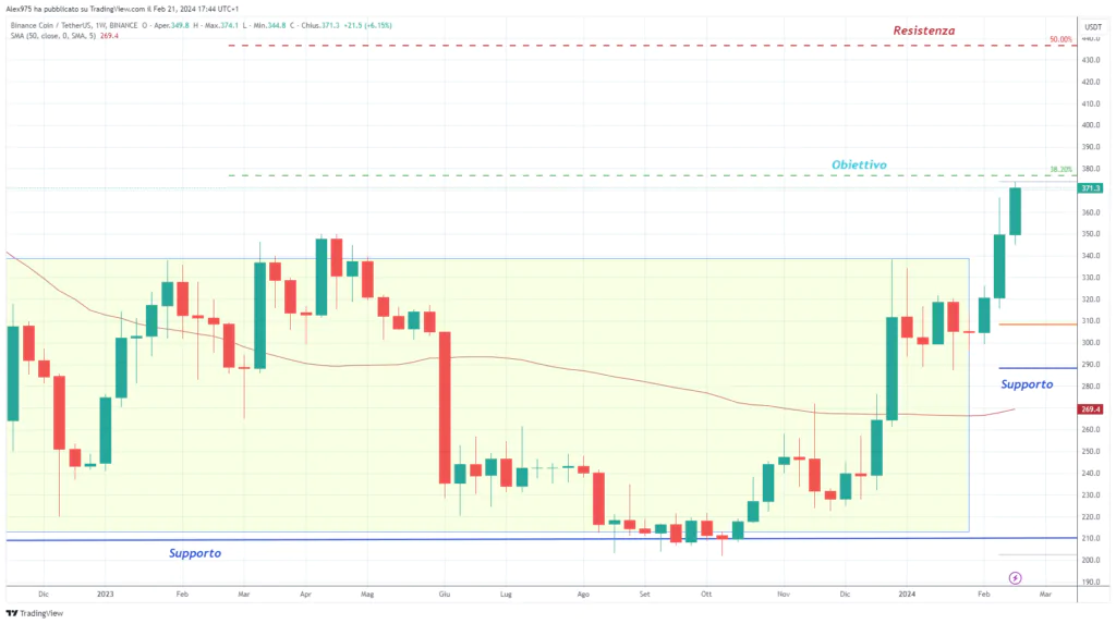 Passando ad analizzare il grafico weekly, si coglie meglio lo scenario, con $BNB che adesso sta raggiungendo il primo livello di resistenza – obiettivo che passa a 375$, il cui superamento darebbe la confermata della forza del rimbalzo.