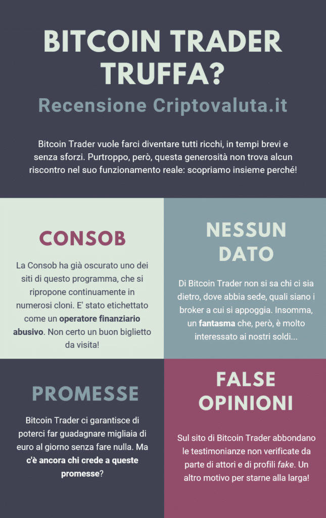 Bitcoin Trader è una truffa - Infografica realizzata da Criptovaluta.it