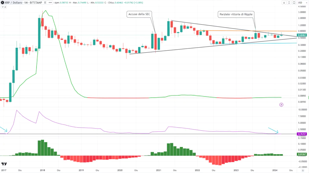 Sul grafico monthly di Ripple, abbiamo una panoramica storica su uno dei token più anziani del mercato crypto, essendo andando in quotazione sugli exchange nel 2013. Da questa prospettiva, si può osservare la fase di compressione che sta vivendo il prezzo ormai da tre anni. La situazione è ulteriormente evidenziata dalla formazione di un pattern a triangolo, il quale negli ultimi mesi è ulteriormente compresso avvicinandosi all’apice.