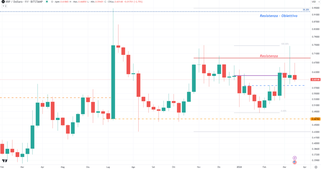 Attualmente, il prezzo di XRP deve andare sopra l’area di 0,69/0,70$ per provare l’allungo verso la resistenza – obiettivo a 0,9270$. Questa è l’area dove il prezzo si era fermato sullo spike rialzista di Luglio 2023, sulla news della prima sentenza favorevole rilasciata dal giudice del tribunale di New York, Analisa Torres. Successivamente l’obiettivo è la resistenza in area 0,92$.