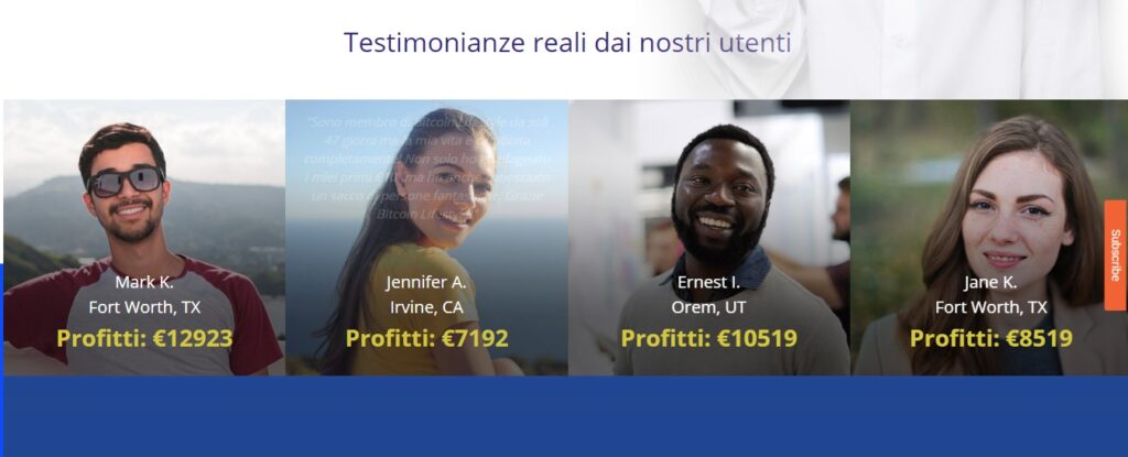 - vengono riportate anche delle testimonianze di utenti che sono diventati ricchi grazie a Bitcoin Lifestyle. Peccato che, anche in questo caso, non ci sia alcun riscontro reale. Le foto sono di attori professionisti, le cui immagini possono essere trovate in tantissimi altri siti internet.