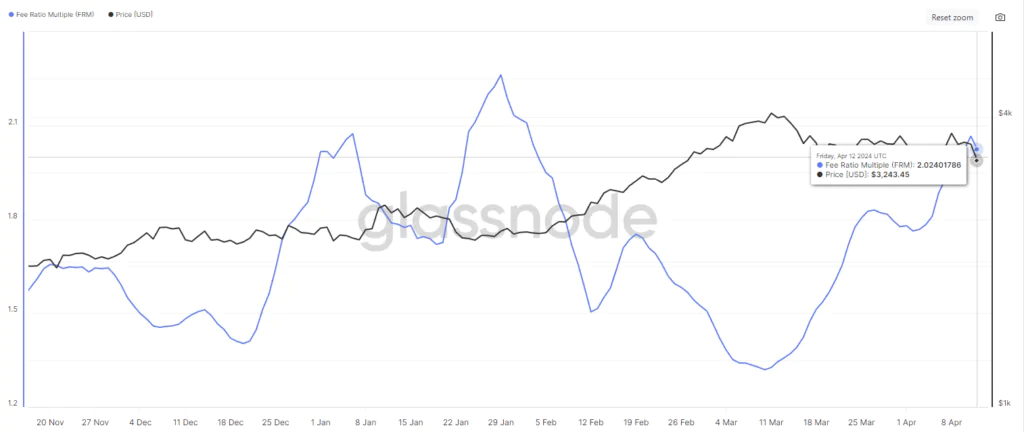 La nuova metrica, la “Fee Ratio Multiple (FRM)“, che misura il rapporto tra le commissioni totali pagate dai partecipanti della rete e il valore dei nuovi ETH emessi nello stesso periodo. Un FRM alto indica una robustezza economica della rete, ma al contempo significa che le entrate dei validatori provengono dalla commissioni di transazione, che risultano elevate.
