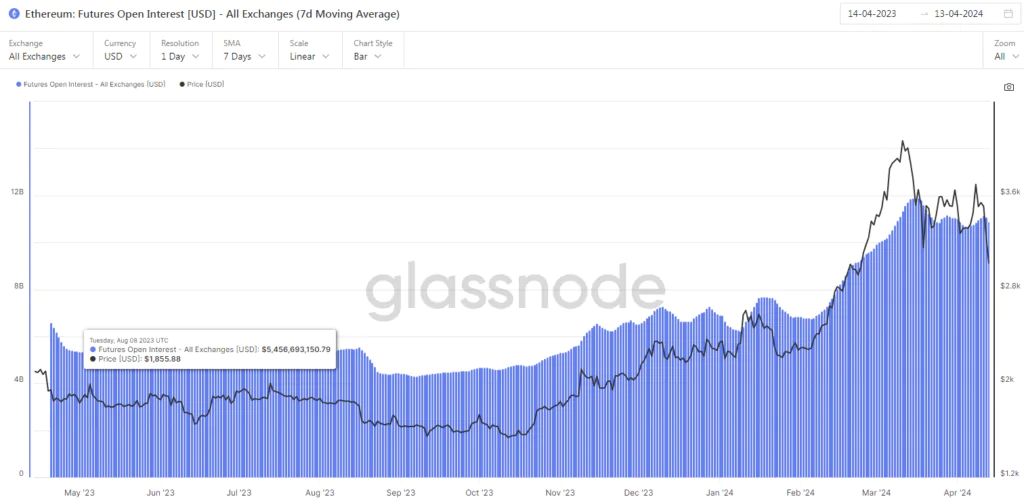 Iniziamo analizzando il prezzo di ETH per valutare l’interesse da parte di trader ed investitori, esaminando l’andamento di “Ethereum: Futures Open Interest [USD] – All Exchanges“.