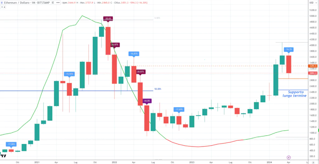 Osservando il grafico monthly di Ethereum si nota chiaramente la candela rossa in atto ad Aprile. Soprattutto il prezzo ha infranto il minimo di Marzo, scendendo a testare il primo livello di supporto di lungo termine che passa a 2.800$ toccando un minimo a 2.845 dollari.
