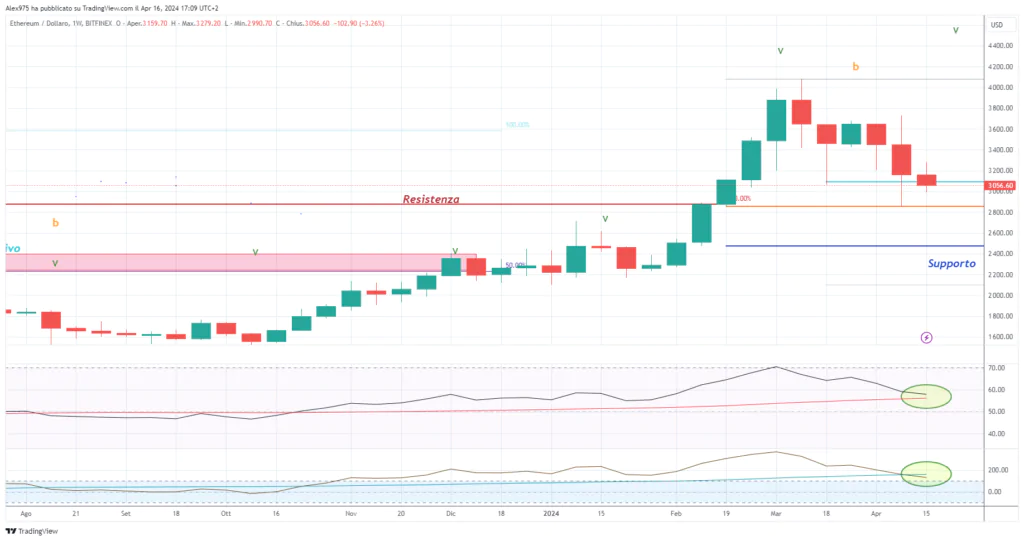 Osservando il grafico weekly di Ethereum, si nota nel dettaglio la fase correttiva dal picco massimo di Marzo. Attualmente il prezzo è entrato nella sua terza settimana di rosso, evento che non accadeva da Agosto 2023.