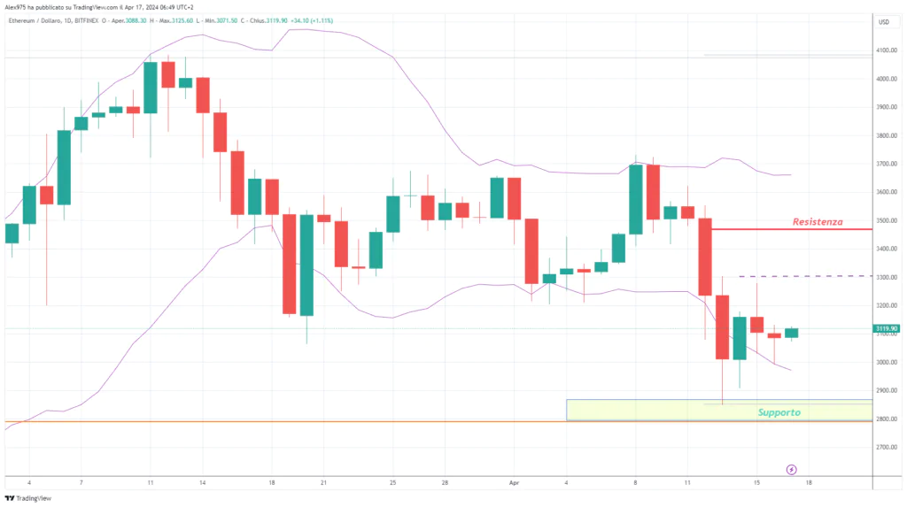 Passando ad una panoramica sul grafico daily, vediamo come il prezzo di Ethereum dal recente minimo sta provando una reazione negli ultimi tre giorni. In questo scenario, per riuscire da questa situazione ribassista, ETH ha una prima resistenza in area 3.300 dollari.