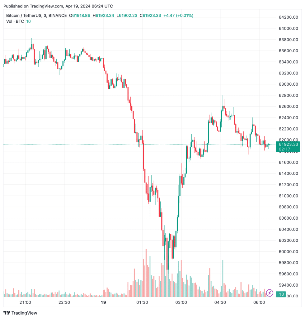 La cosa interessante, dall’angolo delle criptovalute, è che Bitcoin è tornato, anche se per un momento relativamente breve, sotto i 60.000$, salvo poi recuperare dopo che i mercati hanno valutato l’attacco come fortemente limitato.