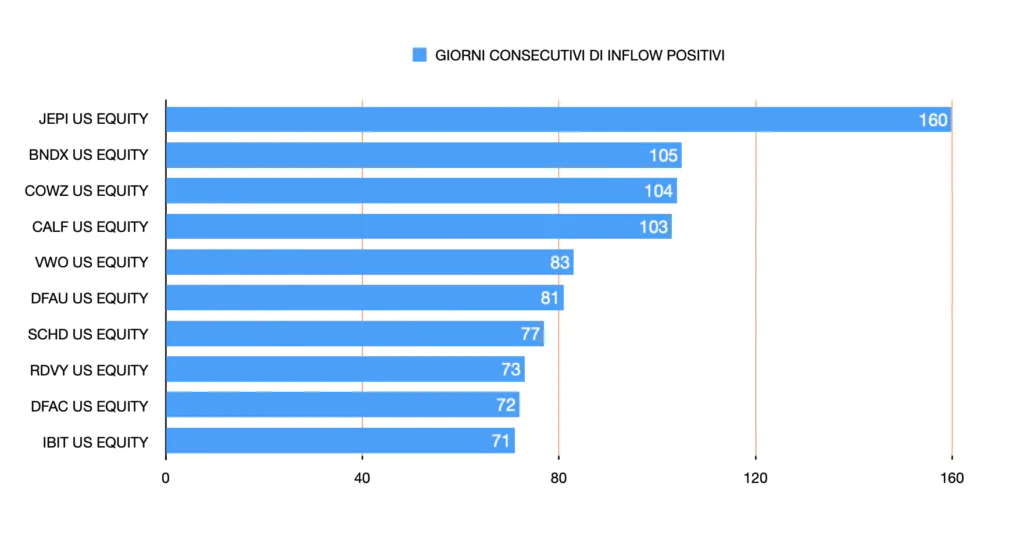 Il secondo dato interessa invece iShares, che è l’entità di BlackRock che gestisce l’ETF Bitcoin. È in strike positivo da 71 giorni. Ovvero ha avuto inflow per 71 giorni di seguito. Un filotto che è importante, anzi importantissimo e che porta questo fondo tra i primi 10 di sempre della storia finanziaria degli Stati Uniti. La cosa interessante è che gli inflow potrebbero ancora continuare, permettendo a iShares di aggredire le prime posizioni della classifica che riportiamo qui per voi.