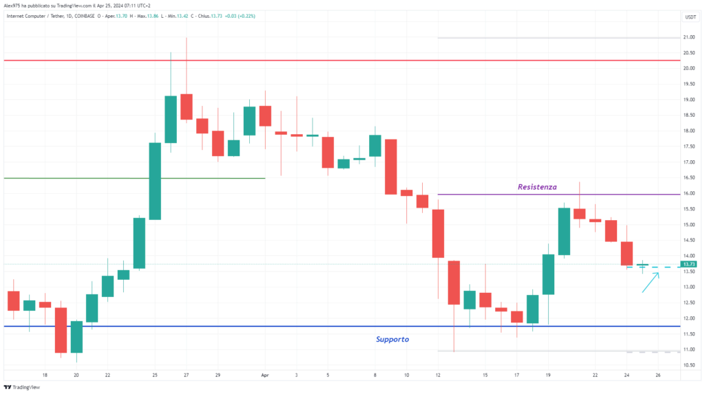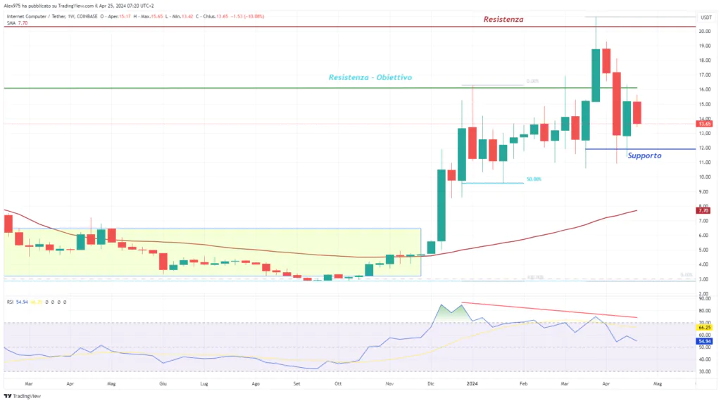 Passando ad esaminare il grafico weekly, possiamo osservare dettagliatamente i movimenti che Internet Computer ha fatto da inizio anno. Dopo aver incontrato la prima resistenza a 16$ il prezzo ha subito una fase correttiva, scendendo fino al livello di supporto di area 9,100$ da dove ha ripreso a salire.