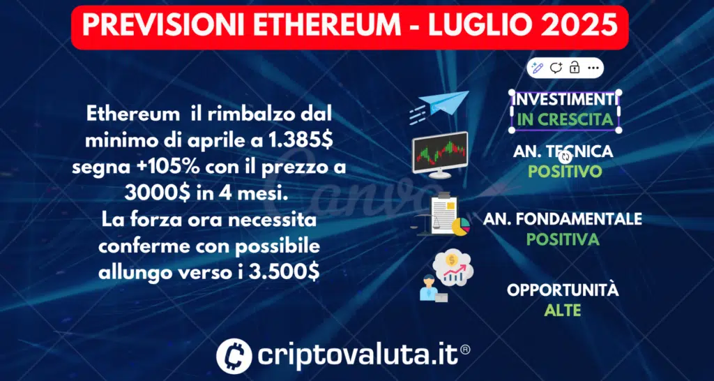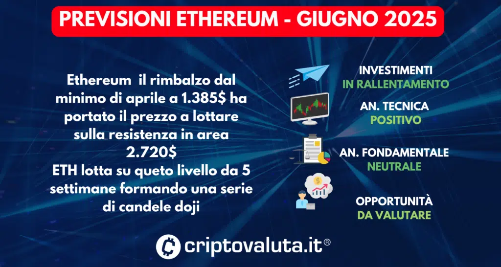 La scheda di analisi previsionale sull’andamento del prezzo di Ethereum (ETH) si basa sull’integrazione di analisi tecnica, dati fondamentali e sentiment di mercato, con l’obiettivo di delineare scenari evolutivi del prezzo nel medio e lungo termine.