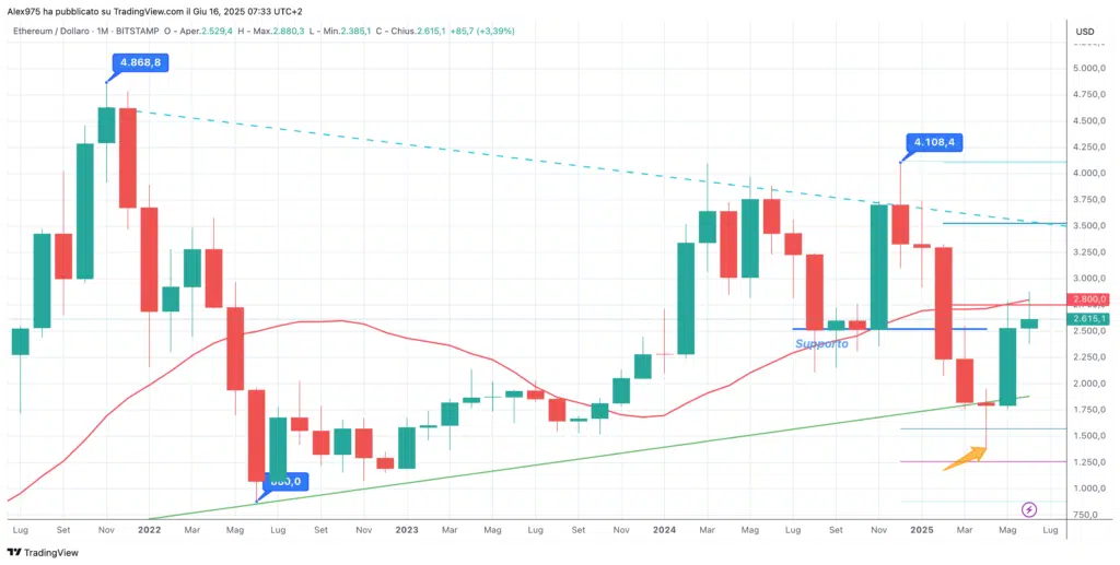 Sul grafico Monthly, abbiamo una panoramica storica del prezzo di ETH dal 2020. Qui si può vedere il suo ATH a 4,868$ del Novembre 2021, da dove è poi partita una fase ribassista con entra in bearish trend che ha portato ad un minimo a 880$ nel giugno 2022.