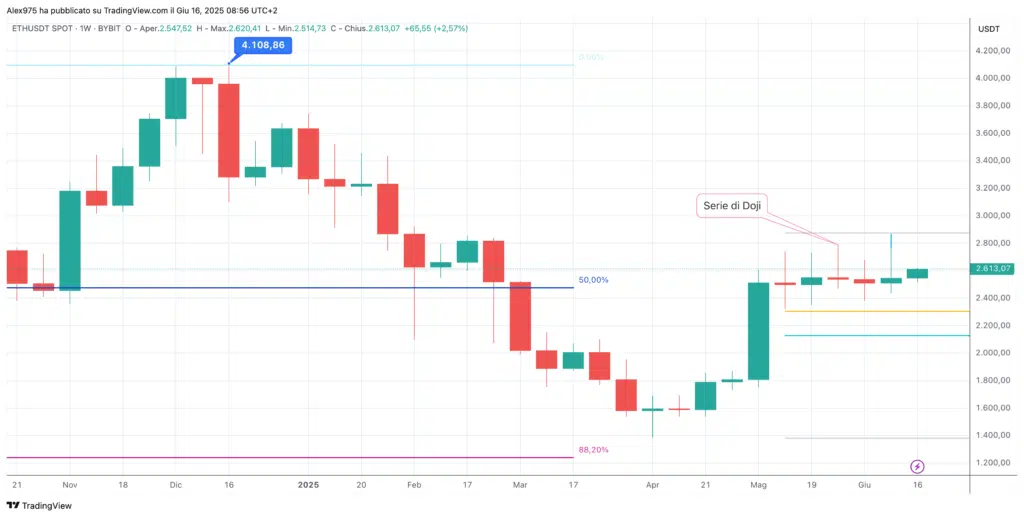 Il 2025 di Ethereum è stato caratterizzato da un andamento fortemente volatile. Dopo aver proseguito la fase ribassista iniziata a dicembre 2024, ETH ha registrato nel primo trimestre un calo complessivo superiore al 50%, con un minimo ad aprile a 1.385$, tornando ai livelli di marzo 2023. Da quel punto è iniziato un rimbalzo tecnico sostenuto dalla formazione di una doji mensile, segnale di inversione. Tra maggio e agosto il recupero è stato deciso, con il superamento della resistenza a 2.720$ e un nuovo massimo storico a 4.955$.