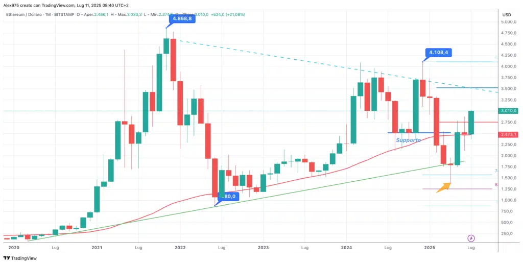 Nel 2025, Ethereum ha registrato uno dei peggiori inizi della sua storia. I primi tre mesi dell’anno sono risultati in rosso fino al minimo di aprile a 1.385 USD e relativa ripartenza con maggio che ha chiuso a +41%. Giugno è stato più volatile anche a causa delle tensioni in Medio Oriente, mentre Luglio ha chiuso a +48,70%. In agosto è stato toccato il nuovo ATH a 4.954 USD.