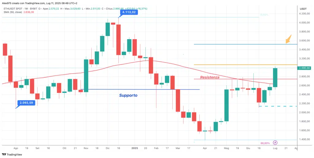 Sul grafico weekly, è ben evidente la forza del breakout della resistenza a 2.720$, con un rialzo weekly che ha registrato un +26,39%. Il rialzo è durato per tutto luglio con una sola correzione rilevante del -9,70%. In agosto il movimento è proseguito fino all’ATH a 4.955 USD. Settembre e ottobre si sono chiusi in contrazione.