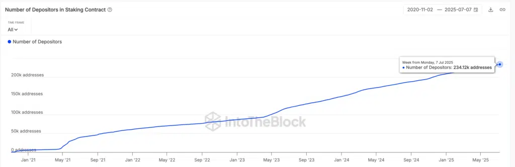 Dal 2023 il valore è quasi raddoppiato, passando dal 16,5%, segnalando un aumento costante della fiducia verso il protocollo e la sua sicurezza. Questo incremento implica una progressiva riduzione della liquidità disponibile sul mercato, poiché una quota crescente di ETH viene immobilizzata nel meccanismo di Proof-of-Stake, rafforzando la stabilità strutturale della rete.