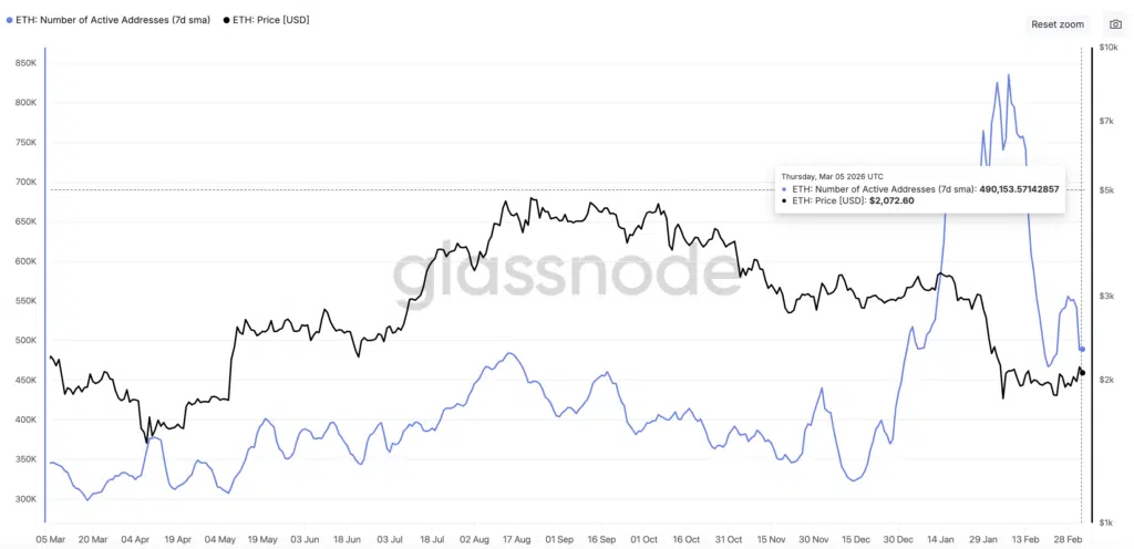 La metrica ETH: Number of Active Addresses misura il numero medio di indirizzi attivi sulla rete Ethereum negli ultimi sette giorni, offrendo un’indicazione sull’utilizzo reale della blockchain. Attualmente il valore si attesta intorno a 490.000 indirizzi attivi, dopo il forte picco registrato tra gennaio e febbraio. La fase recente mostra quindi una normalizzazione dell’attività on-chain, con livelli comunque superiori alla media osservata nella prima parte dell’anno.