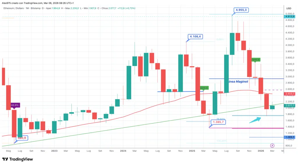 Il 2026 era iniziato al rialzo, ma poi ETH ha virato al ribasso dopo il massimo poco nell’area di resistenza a 3.400$. A febbraio c’è stato un crollo con minimo a 1.740$ con rimbalzo tecnico e seguente fase di lateralità. Marzo è in positivo ma per un segnale, minimo di forza, è necessario che ETH vada almeno sopra i 2.600$
