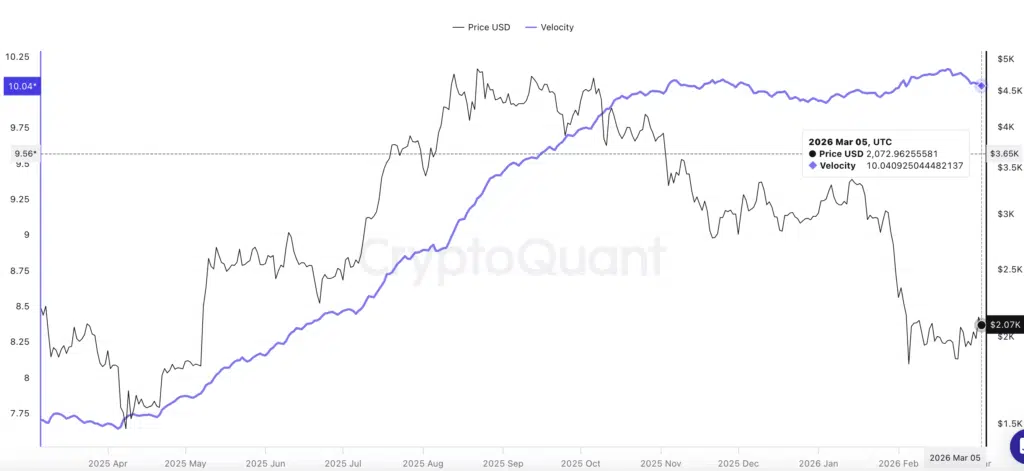 Nella panoramica grafica abbiamo l’andamento dal 2025, dove si vede una crescita in parallelo al prezzo di ETH, con rallentamento e fase di lateralità da quando è iniziata la correzione. Nell’ultima fase la velocity risale verso area 10,0409 segnalando un rallentamento dell’attività di scambio e utilizzo nelle ultime settimane.