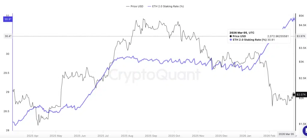 Dall’inizio del 2025 il valore degli ETH staked ha mostrato una crescita graduale, passando da circa 28% fino agli attuali 30,91%. Negli ultimi mesi il dato ha accelerato, nonostante il calo del prezzo. L’aumento dello staking indica una quota crescente di supply bloccata nella rete, riducendo l’offerta liquida disponibile sul mercato.