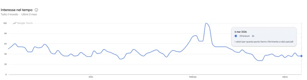 Il grafico di Google Trends mostra l’interesse di ricerca per “Ethereum” negli ultimi 90 giorni, espresso su una scala 0–100 che indica l’intensità relativa delle ricerche rispetto al picco del periodo.