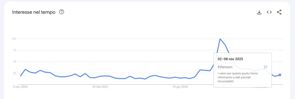 Il grafico di Google Trends mostra l’interesse globale per Ethereum nell’ultimo anno. Dopo una lunga fase di stabilità con valori bassi, l’interesse ha registrato un picco significativo tra fine settembre e ottobre 2025, raggiungendo il massimo a 100 punti. Successivamente, il dato è tornato in calo e novembre segna 21, indicando un rapido calo dell’attenzione.