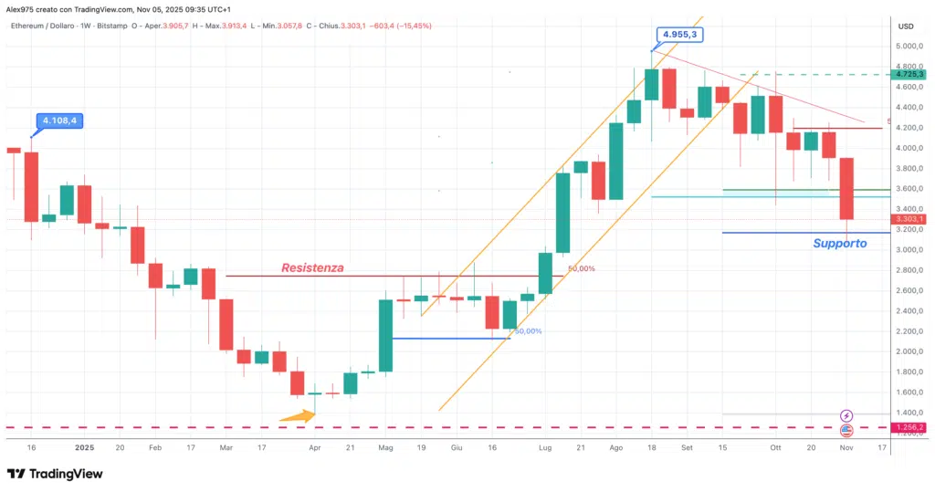 Novembre si sta mostrando fortemente negativo, con un ribasso deciso che ha spinto il prezzo fino al minimo di 3.057$, in corrispondenza dell’area di supporto dei 3.150$. Si tratta del supporto principale definito dal vettore che collega il minimo di aprile all’ATH. La perdita di questo livello potrebbe comportare l’uscita dall’attuale area di leg up in atto proprio da aprile.
