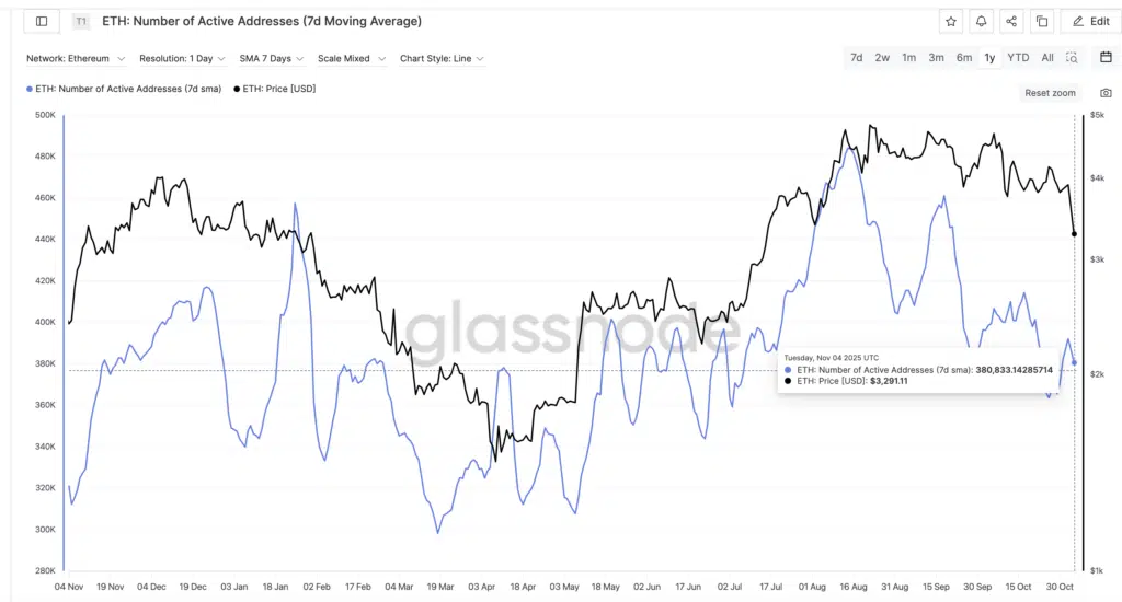La metrica “Number of Active Addresses” di Ethereum evidenzia un andamento altalenante nell’ultimo anno, con una media compresa tra 300.000 e 460.000 indirizzi giornalieri. Dopo il picco di luglio, superiore a 450.000, si è osservata una contrazione fino a settembre, seguita da un moderato recupero in ottobre. Ciò suggerisce una fase di stabilizzazione dove la partecipazione on-chain, pur ridotta, continua a supportare il trend rialzista di medio periodo. In questa debolezza di ottobbre si vede come è proseguita la fase di calo.