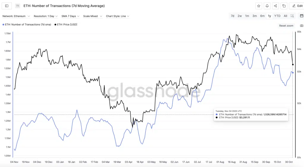 La metrica Number of Transactions di Ethereum mostra un calo dell’attività on-chain di Ethereum. Il grafico di Glassnode evidenzia come il numero medio settimanale di transazioni (linea blu) stia diminuendo, seguendo la fase di debolezza del prezzo (linea nera). Con circa 1,52 milioni di transazioni giornaliere e un prezzo intorno ai 3.291$, il trend suggerisce una riduzione della partecipazione e del momentum sulla rete.