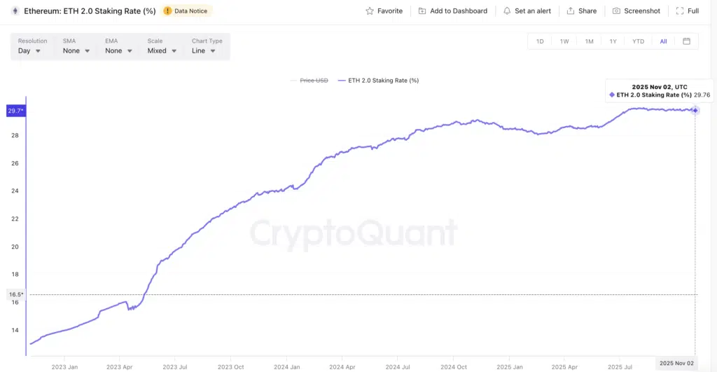 La metrica rappresenta l’andamento del tasso di staking di Ethereum 2.0, che al 2 novembre 2025 si attesta al 29,76% dell’offerta complessiva.