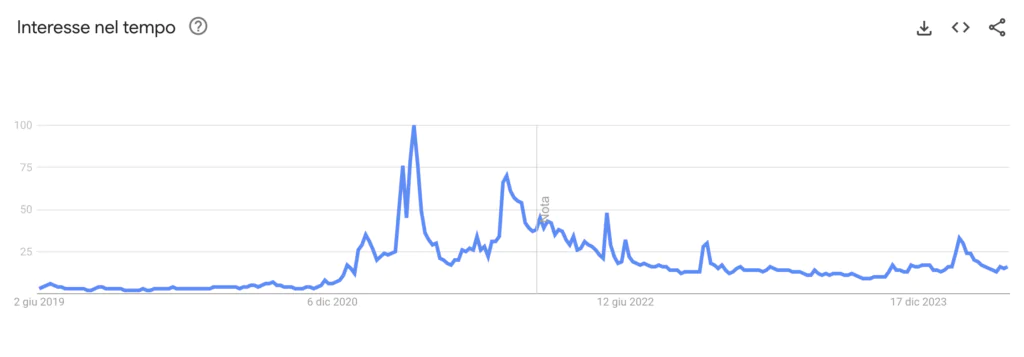 Tuttavia, non c’è ancora quell’entusiasmo sia da parte dei nuovi, sia da parte di chi si è scottato durante l’ultimo bear market. Le ricerche su Google a tema crypto negli USA, nel grafico che qui ti riportiamo, lo confermano. Siamo lontani dai livelli di interesse del 2020 e del 2021. Ed è un buon segnale per chi sta ancora cercando di posizionarsi all’interno del mercato.