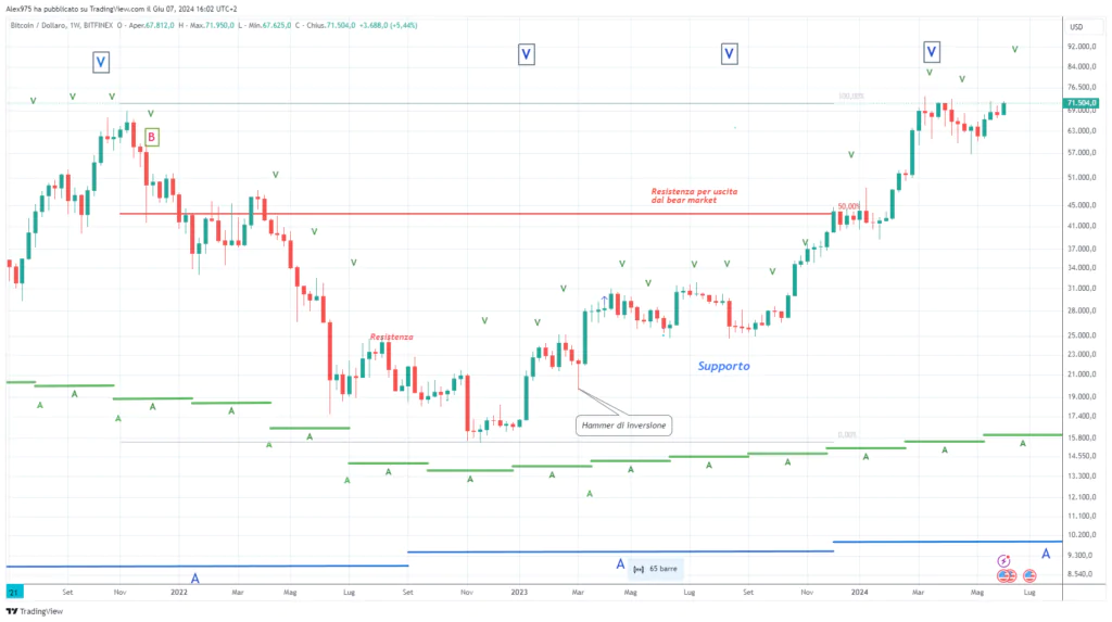Dal grafico si, può notare che Bitcoin sui massimi di Marzo è arrivato su una gobba di vendita (V blu) del ciclo principale di 65 settimane. Infatti, ha avviato la correzione fino al supporto a 56.000$, già citato. In questo scenario, ha ancora tempo per provare una discesa fino alla fine di Luglio, punto(A blu), dove scatterà una finestra di acquisto. L’ideale sarebbe una discesa sui supporti rilevanti di lungo periodo. Tuttavia, nel momento che il prezzo è tornato a metà Maggio sopra la resistenza dei 65.000$ ha interrotto il primo swing ribassista. A livello tecnico un ribasso potrà partire solo con una prima discesa sotto il livello di supporto di breve a 64.000$