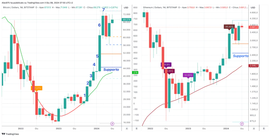 Analizzando lo scenario di Bitcoin su grafico weekly, si vede come abbia “spinto” verso il suo precedente ATH. Il prezzo è salito del 25% rispetto al minimo di 56,711$ registrato a inizio Maggio con lo swing correttivo, fino al primo supporto rilevante in area 56.000 dollari.