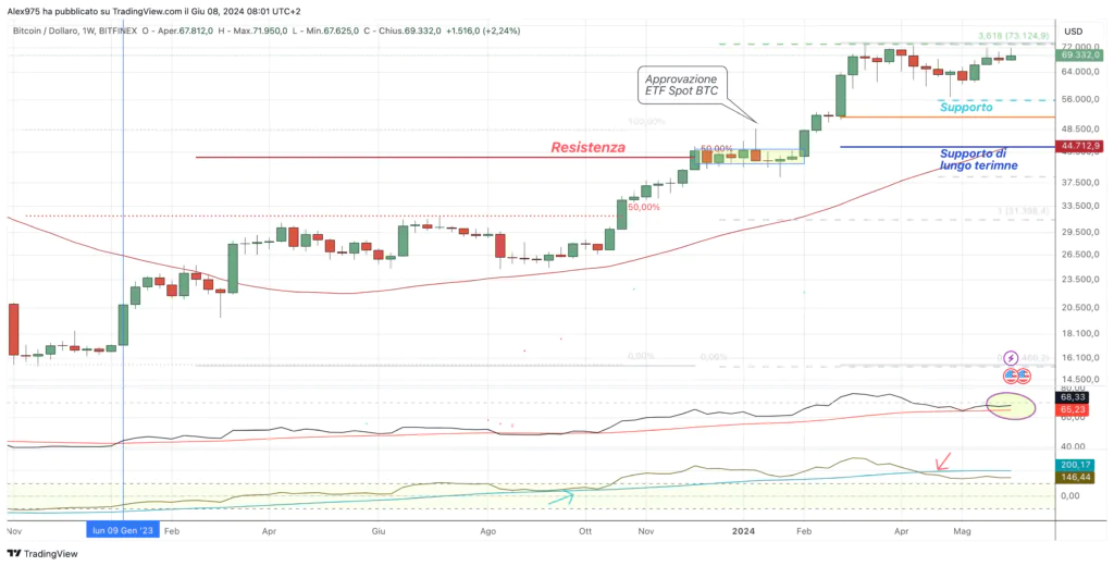 Osservando l’andamento mensile di Bitcoin, si può vedere, come il prezzo sia vicino alla zona dei massimi storici toccati a Marzo, pari a 73.794 dollari. Al valore attuale, dista crica un 5% dall’ATH ((All-Time High). Su questa panoramica, si può vedere un elemento fondamentale avvenuto a inizio Maggio: il test del primo supporto rilevante di lungo periodo in are 56.000$, da dove poi è rimbalzato arrivando a sfiorare i 72.000 dollari.