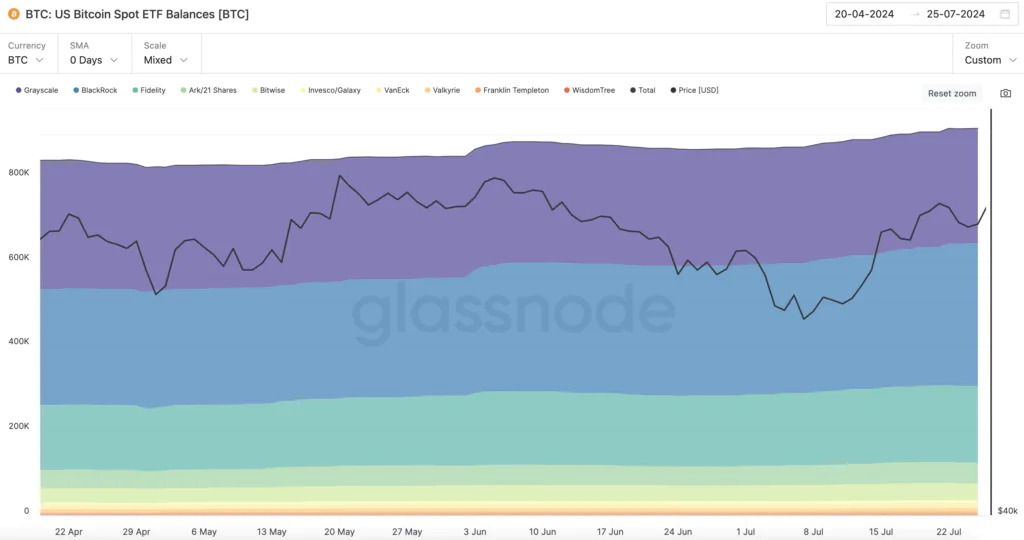 Dalla data dell’halving di Bitcoin del 19 Aprile, il prezzo ha avuto una serie di alti e bassi, segnando, a distanza di 100 giorni, una crescita contenuta del 7%. Osservando la metrica “BTC: US Bitcoin Spot ETF Balances [BTC]” si può vedere che in questo arco di tempo c’è stata una costante crescita delle masse gestite dai primi dieci ETFs. Pertanto, si può dedurre che la crescita della domanda di ETF Bitcoin Spot, ha superato l’offerta di BTC in questo periodo post-halving.