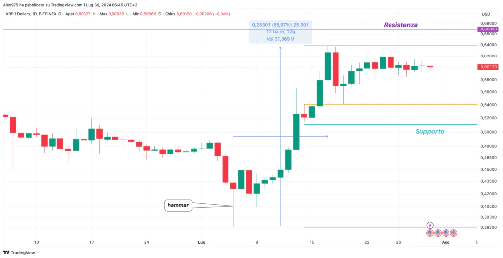 Focalizzandoci sulla situazione del prezzo di XRP sul breve termine, sul grafico daily, possiamo vedere nel dettaglio come il rimbalzo sia partito con la formazione della candela hammer. Nell’arco di 12 giorni ha messo a segno un rialzo del 65%, toccando un massimo a 0,6380$ dove si è fermato e ha iniziato leggermente a ritracciare.