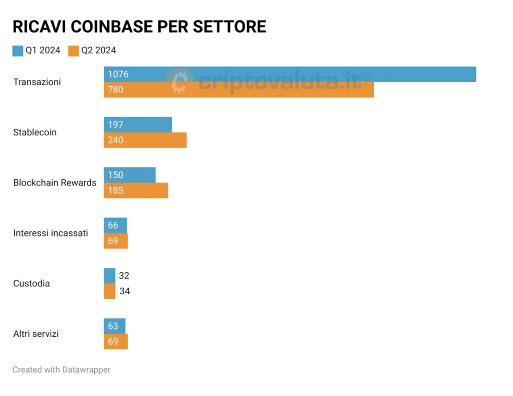 Più interessanti dunque gli altri dati. Ricavi dalle transazioni a più del doppio rispetto a 1 anno fa (ma in calo rispetto al precedente trimestre, ottimi i dati su tutti gli altri comparti, da quanto incassa tramite USDC allo staking, passando anche per i guadagni ottenuti tramite i servizi di custodia, che riguardano anche gli ETF quotati in borsa negli USA (anche se trattandosi di secondo trimestre 2024, la cosa riguarda soltanto quelli Bitcoin).