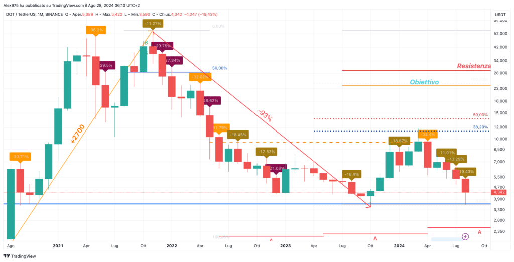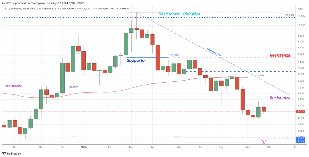 Sul grafico weekly è ben evidente come il prezzo di $DOT, lo scorso Marzo si è fermato sulla prima resistenza indicata nell’analisi del 5 Marzo: