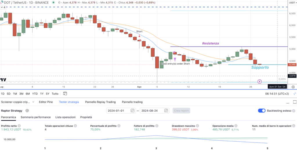 Nella parte bassa del grafico abbiamo riportato la nostra Raptor Strategy. Il report prodotto da TradingView (leggi la nostra guida) riporta l’andamento da inizio anno, con un +19,43% in quattro operazioni, rispetto ad una discesa del prezzo di $DOT che ad oggi si attesta nel corso del 2024 a -47%.